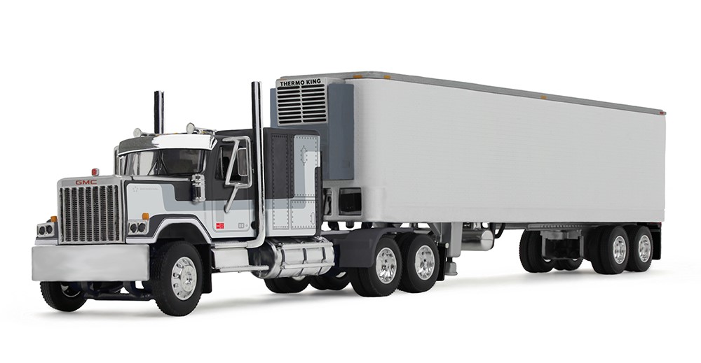 DCP/First Gear 60-1923 Black/White/Silver GMC General 60″ Flat Top Sleeper with 40′ Vintage Reefer Trailer
