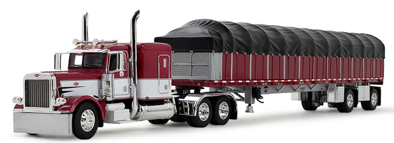 DCP/First Gear 60-2058 Maroon/White Peterbilt Model 389 63″ Flat Top Sleeper w/53′ Wilson Roadbrute Covered Wagon Flatbed