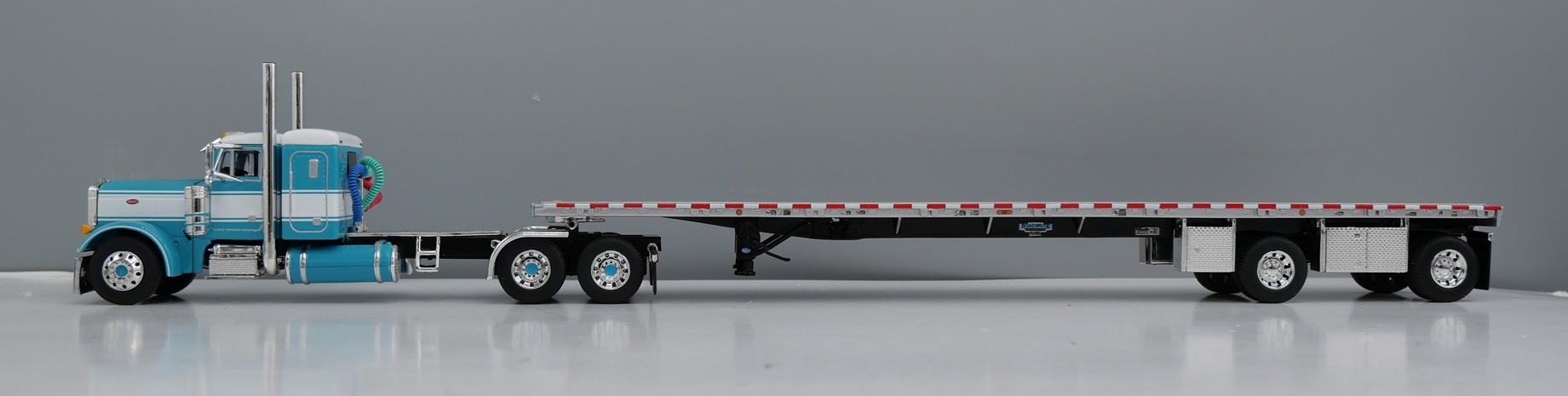 DCP/First Gear 60-2206 Turquoise/White Pete 379 36″ sleeper with silver deck/black frame Wilson spread axle flatbed trailer