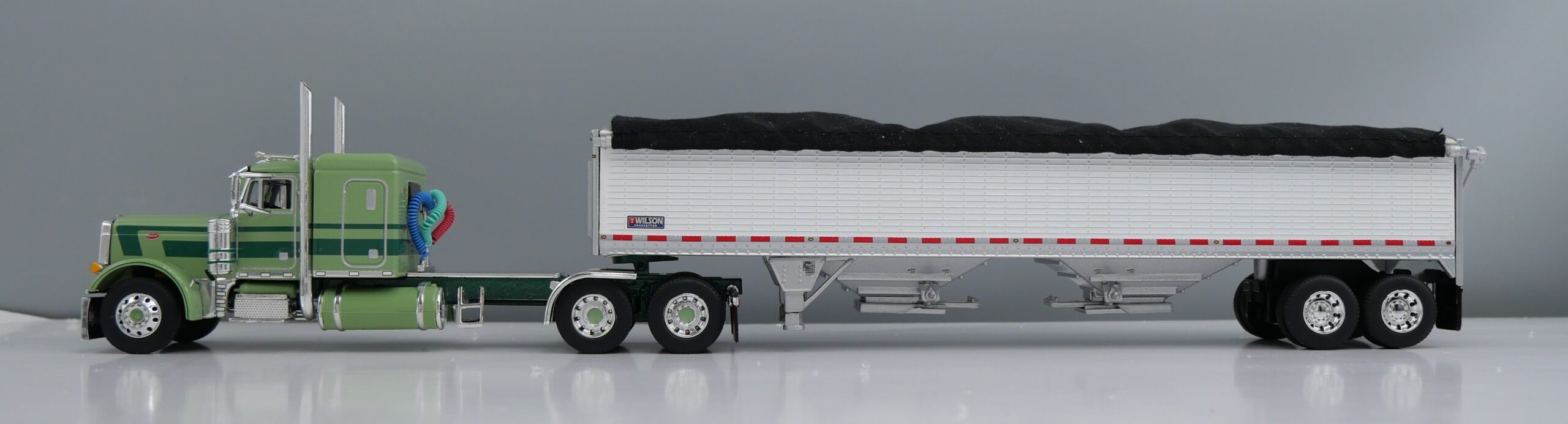 DCP/First Gear 60-2231 light green/dark green Pete 379 48″ flattop sleeper with white sided/black tarp high sided tandem axle Wilson hopper